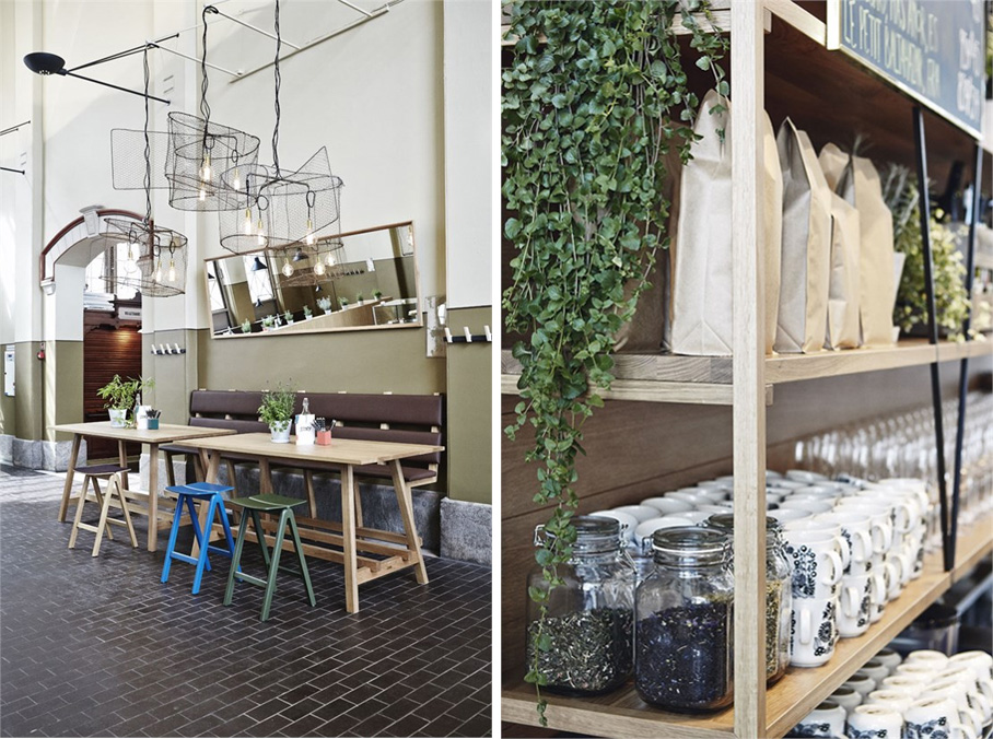 经过长达一年的整修,赫尔辛基的地标Old Market重新开业,应运而生的24小时营业的餐厅/咖啡店Story就处在这座建筑物中。它是由芬兰最重要的四名餐营者合作创办的——Anders Westerholm,Matti Sarkkinen,Teemu Aura和Markus Hurskainen,股东在创建品牌的时候励志要提供当地最新鲜的食材与最舒适的用餐环境。 餐厅坐落的Old Market建筑可以追溯与1889年,修缮后的老建筑保留了原本惊人的挑高,高耸的天花板给这里引入充足的光线。挑高的室内空间给叠放的层叠式结构提供了可能性。在不十分强调个性、注重工艺性、实用性和大众接受度的前提下,Story餐厅里叠加式家具家居产品的介入,很自然地将空间的错层体现出来,让本就高耸的场地显得不那么空旷。店内销售的货品也有序地摆放在置物架上,层层叠叠,条理分明。